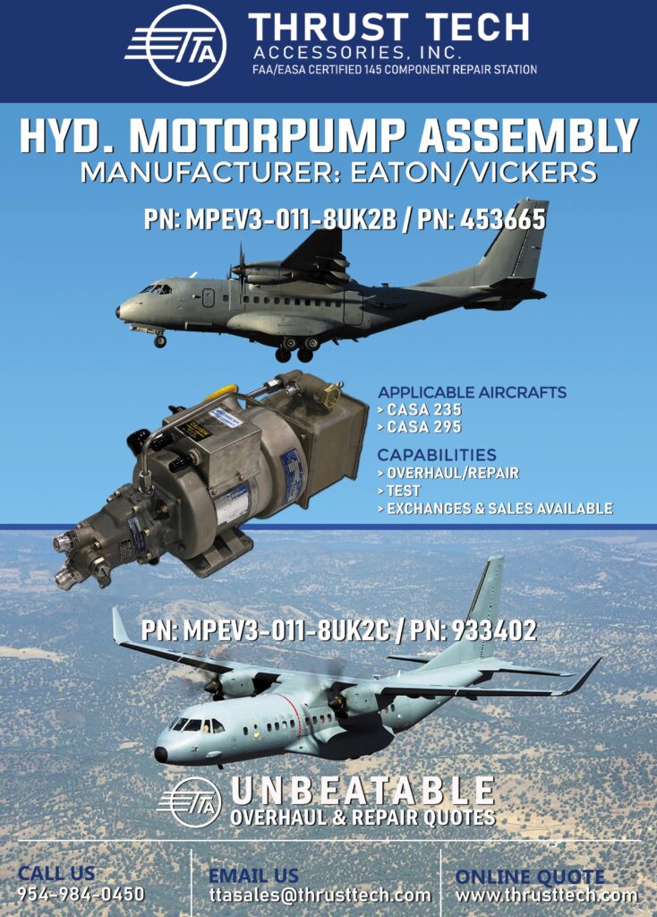 TTA specializes in overhaul/repair and testing of hydraulic motorpump assemblies for CASA 235 and 295. Exchanges & sales also available.